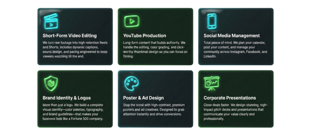 Stop posting average content. We are your creative production house—handling video editing, poster design, and logo creation to turn your social channels into a growth engine